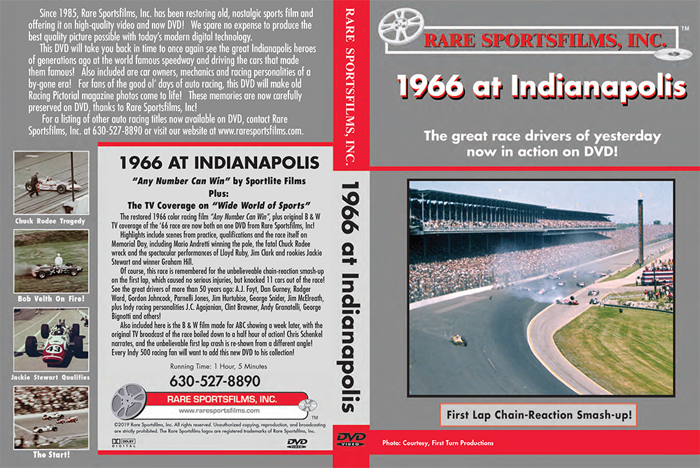 A new DVD of the historic 50th Indianapolis 500 is now available from Rare Sportsfilms, Inc. Just restored is the rare color film "Any Number Can Win" and also included is the B & W television broadcast from ABC's "Wide World of Sports" ! "Any Number Can Win" by Sportlite Films is a hard to find production covering the month of May, 1966 at the Speedway. Narrated by track announcer Tom Carnegie, it shows practice and preparation, qualifications and then the race itself on Memorial Day. Various spins, and pre-race incidents are shown, including those of Al Miller, Lee Roy Yarbrough, Dick Atkins, A.J. Foyt, Bob Veith, and Art Malone. Most notable of course is the tragic crash of Chuck Rodee during qualifications, the first driver killed during qualifications since 1935, and only the third in history. Scenes of qualifying include shots of Rodger Ward, George Snider, A.J. Foyt, Gary Congdon, Dan Gurney, Gordon Johncock, Lloyd Ruby, Jim Clark, Jim McElreath, Parnelli Jones, Jim Hurtubise and rookies Jackie Stewart and Graham Hill. Indy racing personalities and driver close-ups you'll see in this film include Gurney, Clark, Foyt, Jones, Greg Weld and the #15 STP Novi, Hill, rookie Carl Williams, Colin Chapman, J.C. Agajanian, Harlan Fengler, Clint Brawner, Andy Granatelli, Bill Ansted, Pat Vidan, and Bob Wilkie. Cars of drivers (some of which did not make the race) include Ronnie Duman, Art Pollard, Gig Stephens, Bill Cheesbourg, Jerry Grant, Bobby Grim, Johnny Boyd, Al Unser and Roger McCluskey are shown. Before the race, Jackie Stewart, Sam Hanks, Duman and George Bignotti all make comments. Pole-sitter Mario Andretti leads Jim Clark and George Snider down the main straightaway as the green flag waves to start the race, however midway back in the pack, a spectacular chain-reaction smash-up becomes the incident this race would be remembered for! In all, 11 cars (one-third of the field) are knocked out of the race before even a lap is completed! During the cleanup, wrecked cars of Arnie Knepper, Al Miller, Foyt, Gary Congdon, Billy Foster, Gurney, Don Branson and Larry Dickson are shown being towed away. On the first green flag lap of the restart, veteran Johnny Boyd spins out in oil and smashes into the first turn wall, causing another delay and clean-up. The second re-start is successful. After 17 laps and Andretti leading, his engine begins smoking badly, as a dropped valve ends his day on the track. Other incidents and accidents are shown throughout the race. On the 23rd lap, George Snider and Chuck Hulse collide in turn two. Having taken over the lead when Andretti was black-flagged out of the race, Clark spins in turn four and his subsequent pit stop gives the lead to Lloyd Ruby on lap 76 with Parnelli Jones now second. Ruby leads at half way, but a broken cam housing stud causes and oil leak and leads to a black-flag end to his race after 166 laps. Rookie Stewart takes the lead, Clark second, Al Unser third. But on lap 164 Unser crashes in turn four, Hill moving up to third, and Jim McElreath to fourth (two Scots and an Englishman are now running 1-2-3 with two being rookies)! But with only 10 laps to go, leader Stewart has lost oil pressure and is pushing his #43 toward the pits, out of the race. As the drama of Stewart's exit unfolds, Hill passes second place Clark for the lead and continues on to win. Also included on this DVD is half an hour of TV coverage of the race. Before 1971, the 500 was never shown live except on closed circuit TV. However, ABC began to kinescope the race in the mid-1960's and created an edited and re-narrated presentation for nationwide showing a week later on "Wide World of Sports". So, as a bonus, we also present on this DVD the '66 race as shown on ABC after the race. It begins with the re-showing of the big first lap smash-up and is narrated by Chris Schenkel. This race broadcast includes interviews with pole-sitter Mario Andretti (2), Jackie Stewart, Graham Hill (both pre and post-race) and Jim Clark. To get both of these 1966 Indy 500 films now on DVD (total running time, 1 hour, 5 minutes), send $29.95 + $4.00 for shipping. (Illinois residents must add $2.30 state sales tax)