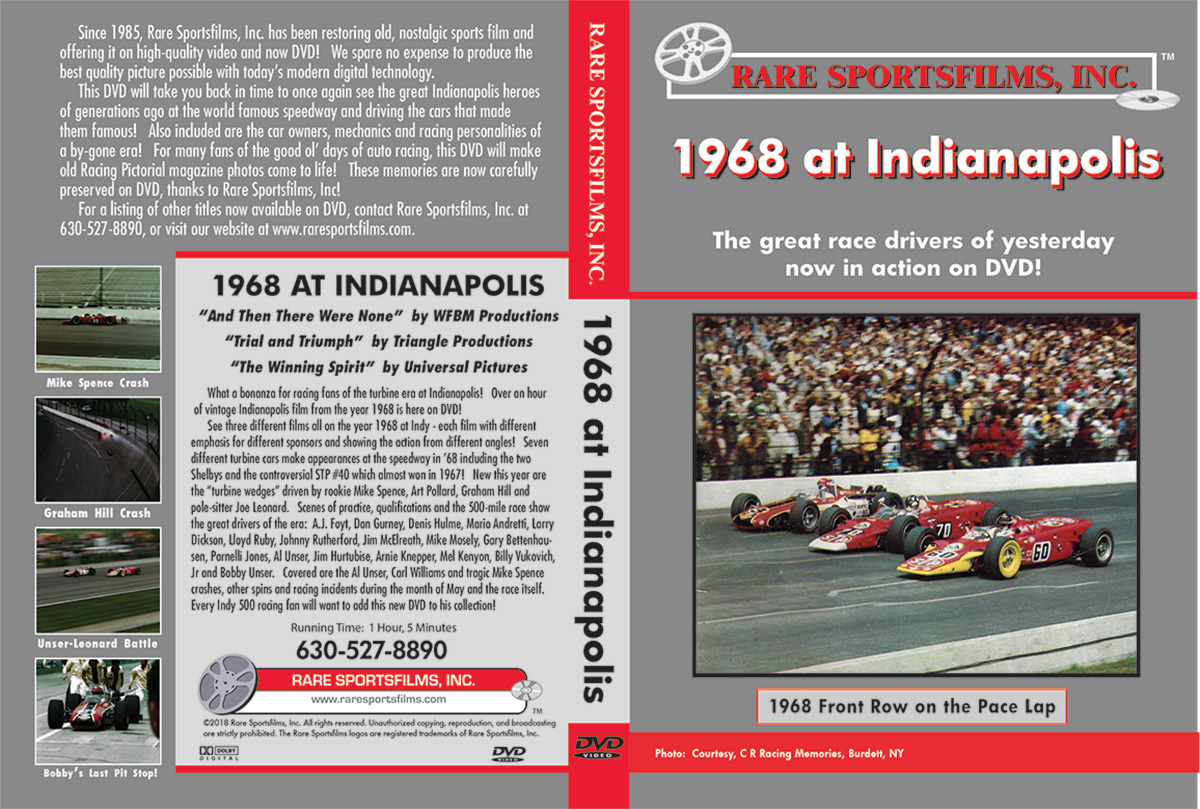 "And Then There Were None", "Trial and Triumph" and "The Winning Spirit" are three vintage films about the 1968 Indianapolis 500, and all three films are included in beautiful COLOR on a new 65-minute DVD from Rare Sportsfilms! "And Then There Were None" was WFBM Productions' first film on the 500 and is narrated by Tom Carnegie. "Trial and Triumph" by Triangle Productions has more driver interviews and is narrated by Les Keiter. "The Winning Spirit" by Universal Pictures is a shorter film on the behind-the-scenes making of the racing movie "Winning", starring Paul Newman and Joanne Woodward and has been added as a bonus!   Even as they all cover Indy in 1968, each shows completely different footage of the race and the story of the month of May leading up to the spectacular classic on Memorial Day! The title "And Then There Were None" refers to the fact that of the seven turbine cars that were brought to the 500 in 1968, none finished the race.   All seven cars are shown at one time or another in this film, including car #'s 66 and 69 of the Shelby stable driven by Bruce McLaren and Denis Hulme (they were withdrawn before the race). The fatal crash of rookie Mike Spence, who was test driving the STP #30 turbine for Greg Weld, is shown. Spence goes high into the first turn and smashes the wall. The wreck knocks off his helmet and tears off both right side wheels, the front one battering his head. After Parnelli Jones gives up his ride in his 1967 "Pregnant Porpoise" #40, Joe Leonard smashes it into the first turn wall, ending the racing life of one of the most controversial cars in the history of the 500. Four turbines are now out with only the STP #'s 20, 60 and 70 left, but these three are later qualified by Art Pollard, Joe Leonard and Graham Hill respectively, as Leonard takes the pole, Hill is second fastest and Pollard starts 11th.   Qualifying day has Jim Philipi interviewing driver Art Pollard and shown qualifying are some of the greatest names in racing: Hill and Leonard, Lloyd Ruby, A.J. Foyt, Dan Gurney, Al Unser, Mario Andretti, Jim McElreath, Jim Hurtubise and Bobby Unser, who qualifies the #3 Rislone special on the outside of the front row. Cars shown that did not make the race are #22 (Bill Cheesbourg), #19 (Sonny Ates), #75 (Ronnie Bucknam), #81 and #88 (Bob Harkey) and #28 (Rick Muther). Other drivers shown are Gary Bettenhausen, Billy Vukovich Jr., Arnie Knepper and Johnny Rutherford. During the race, Graham Hill is running strong in 4th place when his right front suspension fails and he hits the wall in turn two. Hill's #70 is the first Turbine out of the race! With less than 50 miles left in the race, Carl Williams smashes the turn two wall and slides down the backstretch on fire. He exits the car safely then watches it burn during the yellow. There are only nine laps left when the green is waved for the final time. Leader Joe Leonard in turbine #70 however, is slowing down, coasting to a stop in the first turn grass, as Gurney and Bobby Unser whip around him into the lead!   As the leaders come around again, Unser has taken the lead and now Art Pollard in turbine #20 has stopped in the grass in turn three! All of the turbines are out and Unser coasts to victory over the last eight laps!