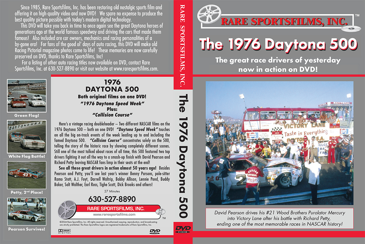 “Daytona Speed Week” and “Collision Course” are two vintage films on the 1976 Daytona 500 and both are included in COLOR on a new DVD from Rare Sportsfilms! “Daytona Speed Weeks” by Car & Track Productions and narrated by NASCAR radio voice Ken Squier, touches on all the big on-track events of the week leading up to and including the famed Daytona 500. “Collision Course”, by Allend’or Productions, narrated by Larry Burrell and sponsored by STP, concentrates solely on the 500, telling the story of the historic race by showing completely different scenes. “Daytona Speed Week” opens at Daytona Beach showing early bird fans enjoying the town and its attractions even as rival crewmen Leonard Wood (David Pearson’s #21 Purolator Mercury) and Maurice Petty (Richard Petty’s #43 STP Dodge) are seen in the garage area preparing their cars during the week. First event shown is the Automobile Club of America’s ARCA 200 in which Lennie Pond’s blue #54 Chevrolet eventually passes top ARCA qualifier Ferrell Harris and his #82 Dodge for the win, a good omen for Pond in the week ahead. A popular event of the week is the IROC race of 8 matched Camaros driven by the greatest drivers from across different types of racing. After flat out racing and 24 lead changes, Benny Parsons wins, while A.J. Foyt captured the series championship for the season. On Friday the Unlimited 500 HP Modifieds take to the infield road course to put on their show and Bobby Allison emerges victorious. As fans keep pouring into Daytona on Saturday, none want to miss the annual Permatex 300 race for late model Sportsman cars, just a step down from their big brothers in tomorrow’s 500. The most spectacular crash of the race shows a spinning Larry Chiles (car #7, blown engine) getting T-boned by Jimmy Walker. The action is re-shown from another angle after Chiles’ car is towed away. Young Joe Millikan of Randleman, N.C. (a five-day-a-week engine room worker at Petty Enterprises) wins the 300 in his Hayes Jewelers red #04 and is shown beaming in Victory Lane. At this point, coverage of the Daytona 500 begins and scenes from within both films, including “Collision Course” show more preparation and action from the race. Cars you’ll see in the garage area or on pit road before the race are those of Dick May, Dave Marcus, D.K. Ulrich, David Sisco, Johnny Ray, Frank Warren and #28 A.J. Foyt. Drivers Richard Petty, David Pearson, Buddy Baker, last year’s winner Benny Parsons, and Darrell Waltrip are seen pre-race. On the pole is #83 Ramo Stott in the Norris Reed Chevrolet with Terry Ryan in the #81 WAM Racing Chevy alongside to start the race. Big names Baker and Petty overwhelm pole-sitter Stott right from the start but Pearson, Ryan, Terry Bivins and Foyt all lead at least one lap out of the first 40. Tom Williams blows his engine on lap 41, leading to his early exit. Other drivers with blown engines are Cale Yarborough, Baker, Tighe Scott, Earl Ross and Dick Brooks. Oil on the main straightaway causes Indy driver Salt Walther to go for a wild ride thru the infield grass, ending up at the pit lane exit! The incident is shown differently in each film and after the caution for cleanup, Walther goes on to finish 12th! After 113 laps, pole-sitter Ramo Stott blows his engine and then hits the wall, triggering the most serious wreck of the race. Skip Manning and Johnny Ray are also involved. Ray is later taken to the hospital with a punctured lung, broken neck and several broken ribs! At this point, a round of pit stops begin and you’ll see A.J. Foyt, Pearson, Petty, Buddy Arrington and Benny Parsons, all in for fast service. Near the end, the second film is better at explaining the pit stop strategy of Petty and Pearson. When Terry Bivins spins on lap 171 bringing out the final caution, Petty ducks in for his last stop. Pearson follows him in and then both leave the pits for their final showdown! Petty leads laps 188 thru 199, but Pearson catches him on the back stretch and as they battle side by side out of the final turn, both cars touch, triggering one of the most spectacular finishes in NASCAR history! Ken Squier’s famous call is heard on the second film, which also includes both Pearson and Petty’s comments after the historic race!