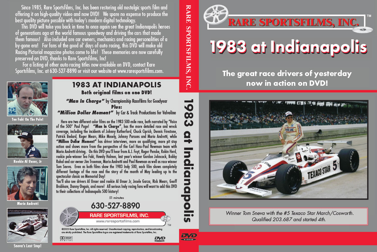 "Man In Charge" and "Million Dollar Moment" are two films on the 1983 500-mile race, and both are included in COLOR on this 54-minute DVD from Rare Sportsfilms!   "Man In Charge" explains the new rules for '83 and has more detailed race and wreck coverage. The second film, "Million Dollar Moment", has driver interviews, more on qualifying, more pit stop action and shows more from the perspective of the Carl Hass-Paul Newman team with Mario Andretti driving. Both films are narrated by "voice of the 500" Paul Page but even as they both show the 1983 Indy 500, each film shows completely different footage of the race and the story of the month of May leading up to the spectacular classic on Memorial Day! Beginning with "Man In Charge" by Championship Racefilms for Goodyear, the DVD opens by showing the practice spins and crashes of Chuck Ciprich, Dennis Firestone and Johnny Rutherford as a lead-in for one of the big stories of the month - the implementation of the new rules for this year's entries regarding design for increased ground clearance. Shown is A.J. Foyt arguing with an official over the clearance of teammate George Snider's red #1 Calumet Farms special. You'll hear Roger Penske, Tom Sneva and March designer Robin Herd explain the purpose of the rules and the necessary changes in car design for 1983. The first weekend of qualifying is rained out, but the following weekend you'll see Mike Mosely, Rick Mears, Sneva, Al Unser Sr and rookie Al Jr, Roger Mears, Josele Garza, Gordon Johncock and A.J. Foyt, qualifying for his 26th consecutive 500! The biggest surprise of qualifying however, is rookie Teo Fabi, a diminutive Italian who scorches the track for an all-time record qualifying speed of 207.395 MPH, easily winning the pole! This year Hall of Fame former driver Duke Nalon will drive the official Buick pace car and Duke compares the car to his first race car at Indy in 1938 as well as explains his duties with the car during the race. On raceday, cars shown being rolled out are those of Al Unser, A.J. Foyt, Patrick Bedard, Sneva and Al Unser, Jr. Witness the traditional pre-race pageantry and drivers preparing to get into their cars: Mike Mosely, Sneva, Fabi, Rick and Roger Mears, Foyt, rookie Al Unser Jr, Gordon Johncock and Kevin Cogan. At the start pole-sitter Fabi jumps out to a lead with Rick Mears second, Mosely third and Rahal fourth. On lap 24 Fabi pits and Mosely leads for a lap, then Mears for two and Al Unser, laps 27-35 until Sneva leads for the first time on lap 36. The first accident of the day occurs when Patrick Bedard brushes the wall out of turn four and coasts to a stop against the outside wall on the main straightaway. Safety crews are shown assisting the uninjured driver. Sneva is still leading on lap 43 when Roger Mears loses the Machinists Union #9 in turn one, heavily crashing into the outside wall and you'll see emergency workers help him safely out of the car. Four laps later Fabi's promising race comes to an end in the pits as a refueling o-ring fails during his routine stop. Al Unser Sr is leading at 180 miles when Johnny Parsons loses control in turn one and tangles with Mario Andretti, taking both cars out of the race. More pit stops are shown in the second film, however in this one Sneva is shown taking on fuel only on the 89th lap. Shown in the pits also are Al Unser Jr and Gordon Johncock. Tom Sneva is leading the race at the 3/4 mark when Johncock makes his exit with a broken gearbox. Early leader Mike Mosely, still running 6th after 420 miles, suddenly hits the wall in the short chute and is out, finishing 13th. The Mosely caution gives both leaders Sneva and Al Unser a chance to duck into the pits together. Al gets out first and Unser leads Sneva by about 10 seconds! Now, it's a final 25-lap sprint to the finish with Al leading, Sneva 2nd, but with Al Jr. (several laps down) in between them and making it difficult for Sneva to get by. With 10 laps to go, Sneva finally passes Al Jr at the entry to turn one and then increasing his speed, sets his sights on Al Sr. By the end of the backstretch, Sneva takes the lead for the final time and the first driver to ever qualify at over 200 MPH has finally won Indy! "Million Dollar Moment" by Car & Track Productions for Valvoline is a different film on the '83 race and there are more interviews in this one! Also cars not seen in the first film are those of Chip Ganassi, Dennis Firestone, Steve Chassey, Howdy Holmes, Derek Daly, Dick Simon, Billy Vukovich, Pete Halsmer, Jerry Karl, and Gary Bettenhausen, some of which did not make the race. There are a lot more scenes from qualifications on this film and no explanations about the new rules, except noting that 15 drivers including A.J. Foyt are forced into third day qualifying status for improper ground clearance and will be relegated to the rear of the field. Qualifying weekend approaches and former winners Foyt, Andretti and Johncock are struggling to reach speeds of 195 MPH, while younger drivers such as Al Jr, Rahal and Teo Fabi are easily running over 200! As the opening week of qualifying is rained out, the film interviews several drivers, some of which were glad for the rainout (Johncock, and Mario), while Fabi and Rahal explain it's a shame have to wait an extra week, because they are ready. Brief scenes of qualifying show Rahal, Mosely, Foyt and especially record-setting rookie Teo Fabi. Lots of scenes of the Haas-Newman team and Paul Newman, including soundbites from both Newman and Mario. Then the color and traditions of raceday are shown, including a clearer picture of what happened last year as Foyt reveals how he usually handles the start and what "Indianapolis" means to him. The front row this year is Fabi, Mosely and Rick Mears. The three major wrecks of the race are also shown in this film (Roger Mears, Parsons-Andretti and Mike Mosely) but all from different angles. A.J. Foyt's early exit from the race is given more coverage in this film. Othe