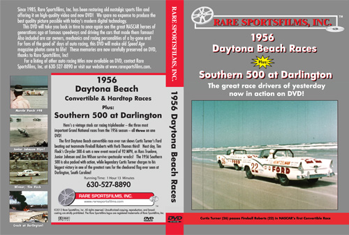 The 1956 NASCAR Grand National Daytona Beach races (both convertible and hardtop), a short film on racing 1956 Chevrolets and the 1956 Southern 500 at Darlington are now all on DVD for the first time ever - only from Rare Sportsfilms! Performance... Pure Performance tells the story of the first NASCAR convertible race ever run and the 1956 Beach Race the following day. Both races are preceded by the popular speed performance trials on the famous measured mile. Lots of ’56 T-birds are shown, including Ford’s Chuck Daigh driving one with a modified body. Runs of Dan Eames and Murray Hartley are also shown. Saturday’s event is the first NASCAR race ever run in Bill France’s new “Convertible Division”, a series that would only last four years! Joe Weatherly is on the pole, with Jimmy Thompson alongside and Don Oldenberg and Herb Thomas in the second row. Weatherly leads the first six laps until overtaken by Ford teammate Curtis Turner, who is never headed and sets a new 160 mile, 96.11MPH record! Turner, Fireball Roberts and Thomas finish 1-2-3. Next day, the traditional Daytona Grand National Hardtop race is run, with Tim Flock on the pole and Speedy Thompson alongside in big white Kiekhaefer Chryslers. Flock wins, Billy Myers’ #14 Mercury is second and Ralph Moody in #12 Ford is third (even after a rollover), but there is even more action during the race! Most spectacular is Russ Truelove’s crash on the beach straightaway coming into the north turn. His #226 Mercury flips high in the air and does a roll, shedding windshields and parts before coming to rest outside the course! Later, young Junior Johnson rolls his blue #55 Chevy four times near the north end of the beach and climbs out the back window to safety! Other cars you’ll see during the hardtop race are those of Ralph Liguori, Cotton Owens, Blackie Pitt, Ed Kretz and Bob Korf. Included on this DVD is another film showing the action from other angles and different views. Thunder Beach shows both beach races from the perspective of the Peter DePaolo Ford team of Ralph Moody, Curtis Turner, Fireball Roberts and Joe Weatherly. In the Ford film, a Curtis Turner pit stop is shown, and a bigger deal is made of Moody finishing third in the hardtop race after spinning out.  Other cars are shown also, such as those of Red Duvall, Bill Brown, Bill Lutz, Marvin Panch, Bill Widenhouse, Lyle Scott, Pat Zocanno, Jack Radtke, Jim Cushman, Eddie Skinner and Walt Shubert. A spectacular shot captures the south turn rollover crash of Jim Wilson and Buddy Krebs! Not to be outdone, Chevrolet’s film The Big Winner promotes victories in 1955 and 1956 for Chevrolet. Included is Jim Reed driving in a demonstration race at Gardena Stadium on Western Avenue. In-car camera shots of Reed during the race add interest to Chevy’s 1956 racing promotional film. One of the all-time classic racing films, the 1956 Southern 500 at Darlington is pure nostalgia – mid-1950’s stock car racing at famed Darlington Raceway! All the colorful action of the 7th Annual “Southern 500” can once again be seen as the action took place – over 50 years ago! Sit in on the official qualifications, inspection and work in the garage area. See the annual beauty pageant held the night before the race, and of course, all the great drivers of those days gone by: Paul Goldsmith, Herb Thomas, Marvin Panch, Speedy Thompson, Buck Baker, Tim and Fonty Flock, Lil’ Joe Weatherly, Jim Paschal, Fireball Roberts and Curtis Turner, all driving the cars that made them famous and all in gorgeous COLOR! Back in the days when cars went racing right off the showroom floor, and before anyone had ever dreamed of Daytona International Speedway, AIMS, AIR or MIS, Darlington was THE superspeedway – the fastest stock car track in the world! For ten years, the Labor Day race at Darlington was the World Series of stock car racing, where asphalt speed records were set and broken again and again. This DVD takes you back to 1950’s NASCAR racing at its best and most exciting! Thrill as you watch the pace lap and see the field of 70 1956 stock cars take the green flag and head into turn one at 100 MPH! You’ll see plenty of spins and crashes (70 cars at 110 MPH on a 1.4 mile track?), and even a spectacular fire in turn one as a gas tank is ripped from a car and ignites! Three-time winner Herb Thomas hits the guardrail and spins twice, but there’s plenty of pit action, too, as famed mechanic Smokey Yunick installs a new radiator in Herb’s orange #92 so Thomas can go back racing! Hard-driving Curtis Turner in his #99 purple and white Ford sets a new record on his way to a smashing victory in one of the greatest runs for the checkered flag ever seen.