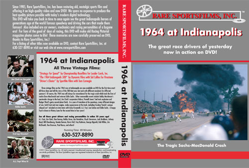 “Strategy For Speed”, “The 1964 Indianapolis 500” and “Driver’s Choice” are three vintage films about the 1964 Indianapolis 500, and all three are included here in COLOR on this new 89-minute DVD from Rare Sportsfilms, Inc! Each of these films is entirely different, even as they all show the events recorded during the month of May 1964 at the speedway and during the 500-mile race! Of course, the 1964 500 will always be remembered for the most tragic wreck in speedway history, which took the lives of rookie Dave MacDonald and popular veteran Eddie Sachs.