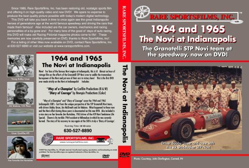 For years, the sound of the powerful Novi engine had raised hairs on the backs of the necks of true racing fans at Indianapolis. The Novi was probably the most popular engine ever entered, and the fact that, in spite of its' tremendous horsepower, it never carried a driver to victory has added to the mystique and brickyard legend of the Novi. In the early 1960's the Granatelli brothers further refined and developed the engine, and added four-wheel drive to put more Novi horsepower directly on the track for better cornering in the turns. This valiant effort to finally put a Novi in victory lane is documented in two films, "Way Of A Champion" by Confilm Productions and "Diary Of Courage" by Newspix Productions, both made for STP. This new 58-minute DVD tells the Novi story of 1964 and 1965 at the Indianapolis Motor Speedway.