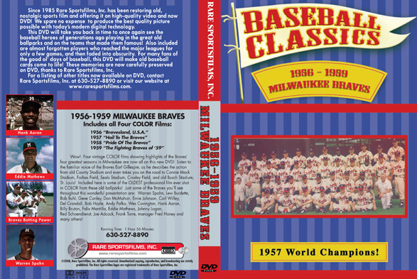 Four vintage COLOR films showing highlights of the Braves’ four greatest seasons in Milwaukee are now all on one new DVD! All are narrated by long time radio voice of the Braves Earl Gillespie, and he describes the action from old County Stadium in Milwaukee as well as from other long-gone ballparks throughout the league, including Connie Mack Stadium, Crosley Field, Seals Stadium, The Coliseum, Forbes Field and old Busch Stadium, St. Louis! These were truly the “glory years” of baseball in Milwaukee, as the Braves led the MAJORS in attendance five consecutive years and set a new National League record with 2,215,404 for a single season in 1957! The club won two pennants, a World Championship, and just missed two more pennants by only a game each season!