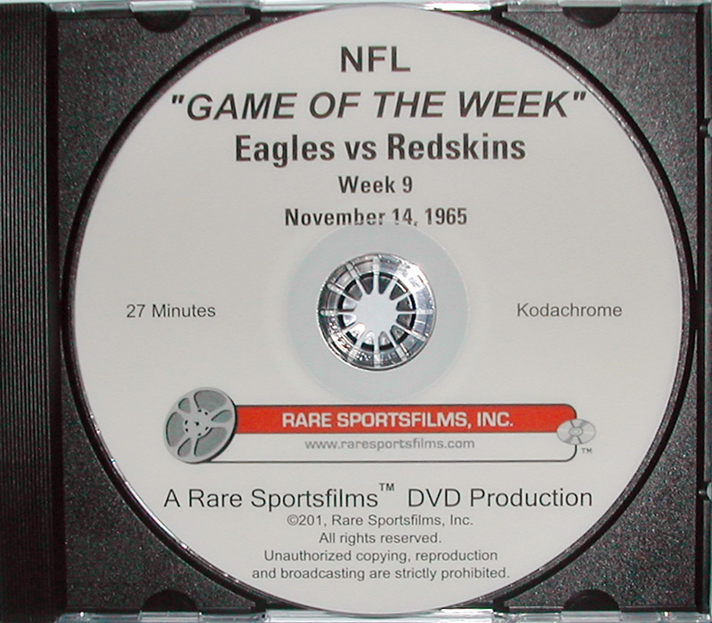The November 14, 1965 Eagles-Redskins NFL "Game-Of-The-Week" film is another nostalgic title from the vast Rare Sportsfilms library of old pro football films not available from any other source - not even NFL Films has this one! Narrated by Tom Brookshier, this 27-minute film, now available on DVD, is in gorgeous COLOR!